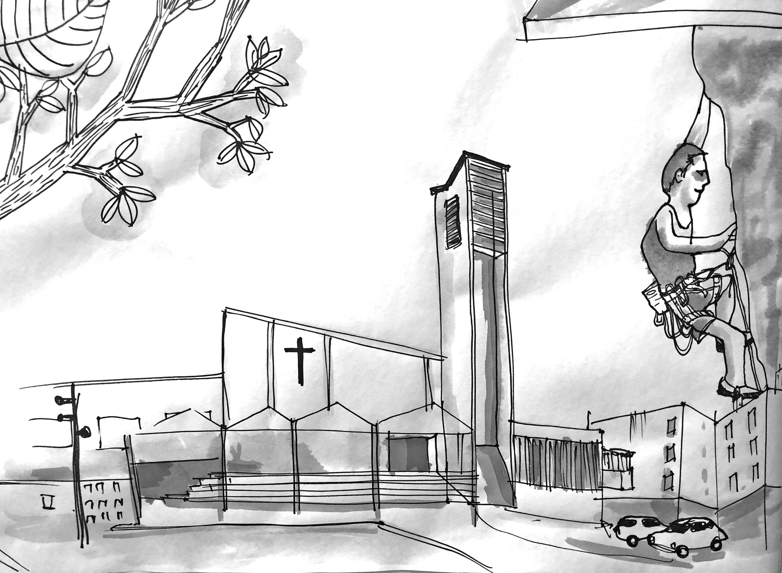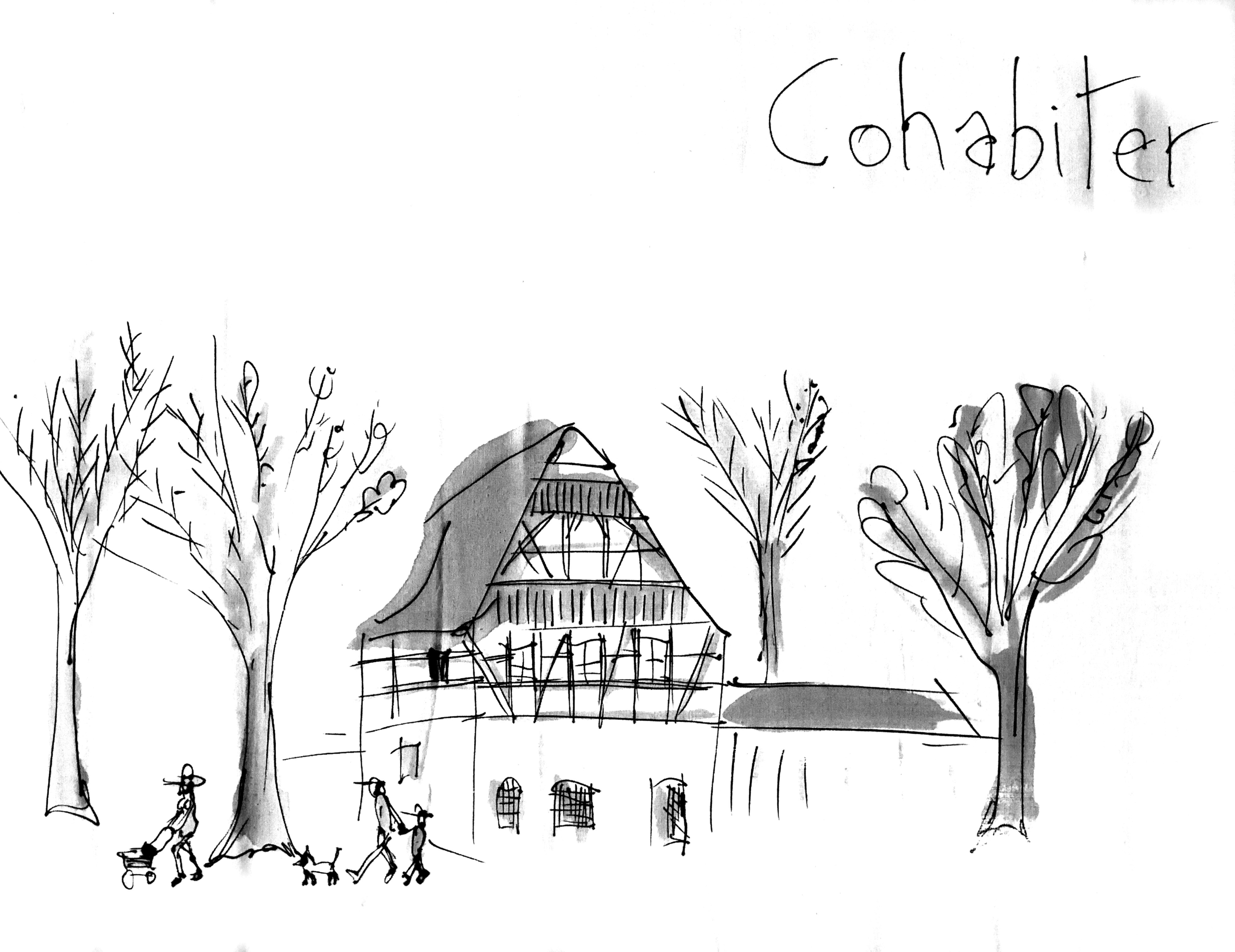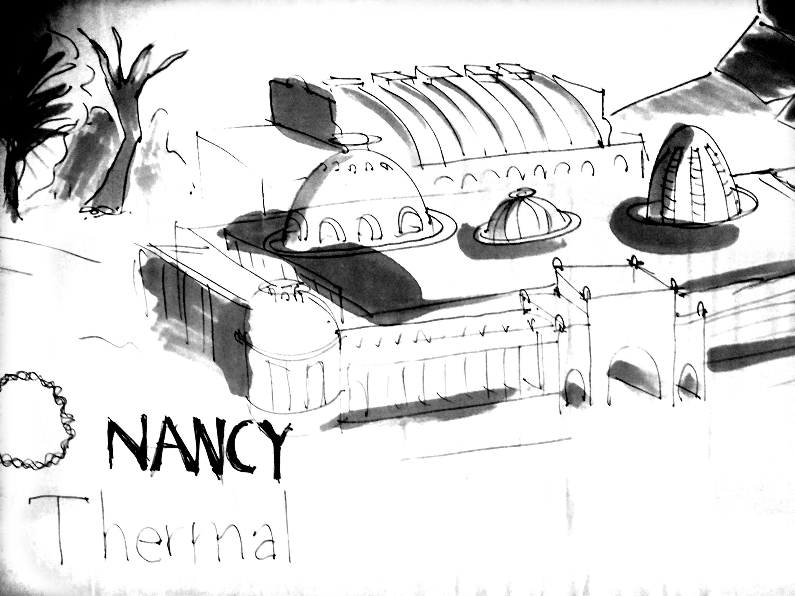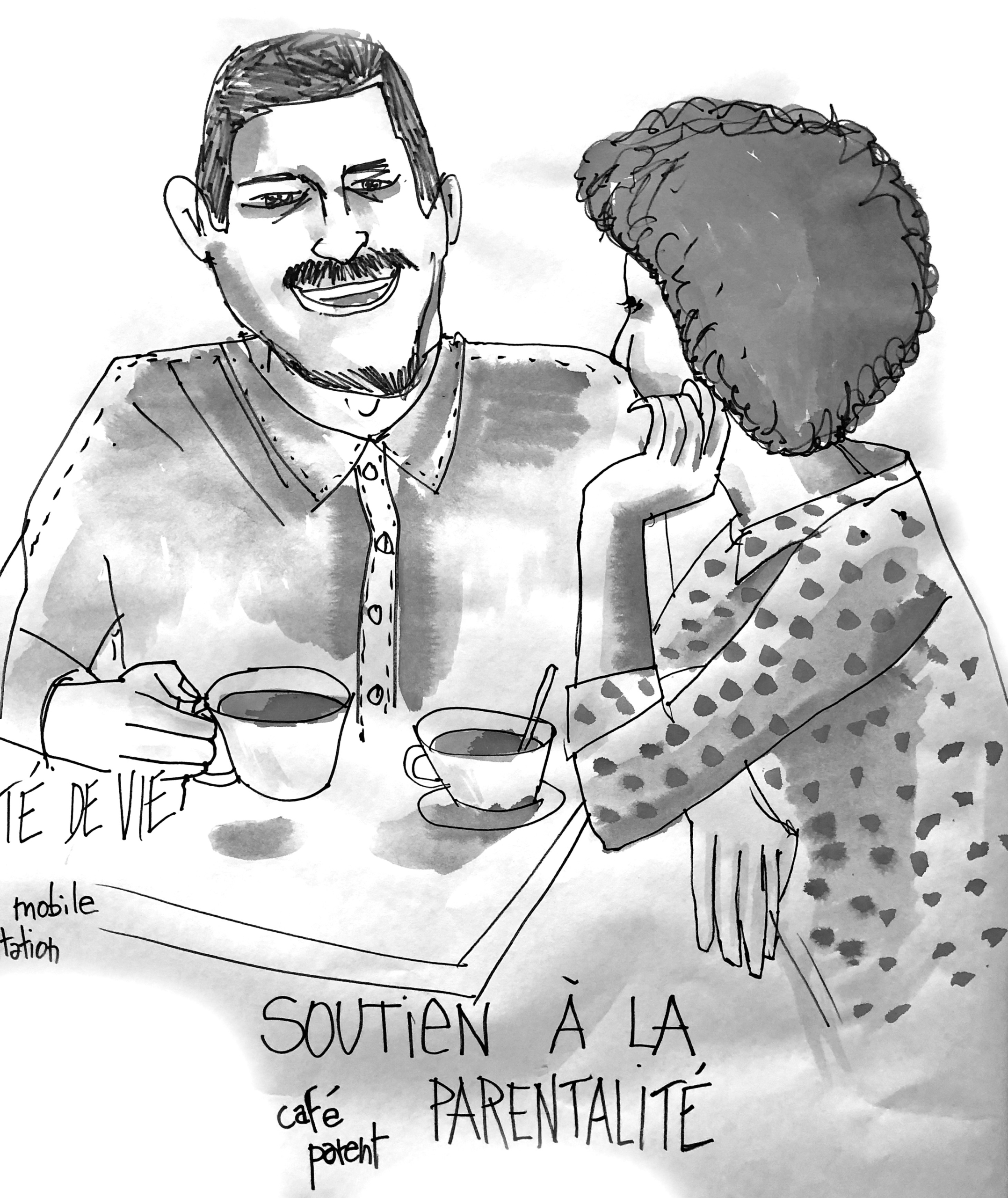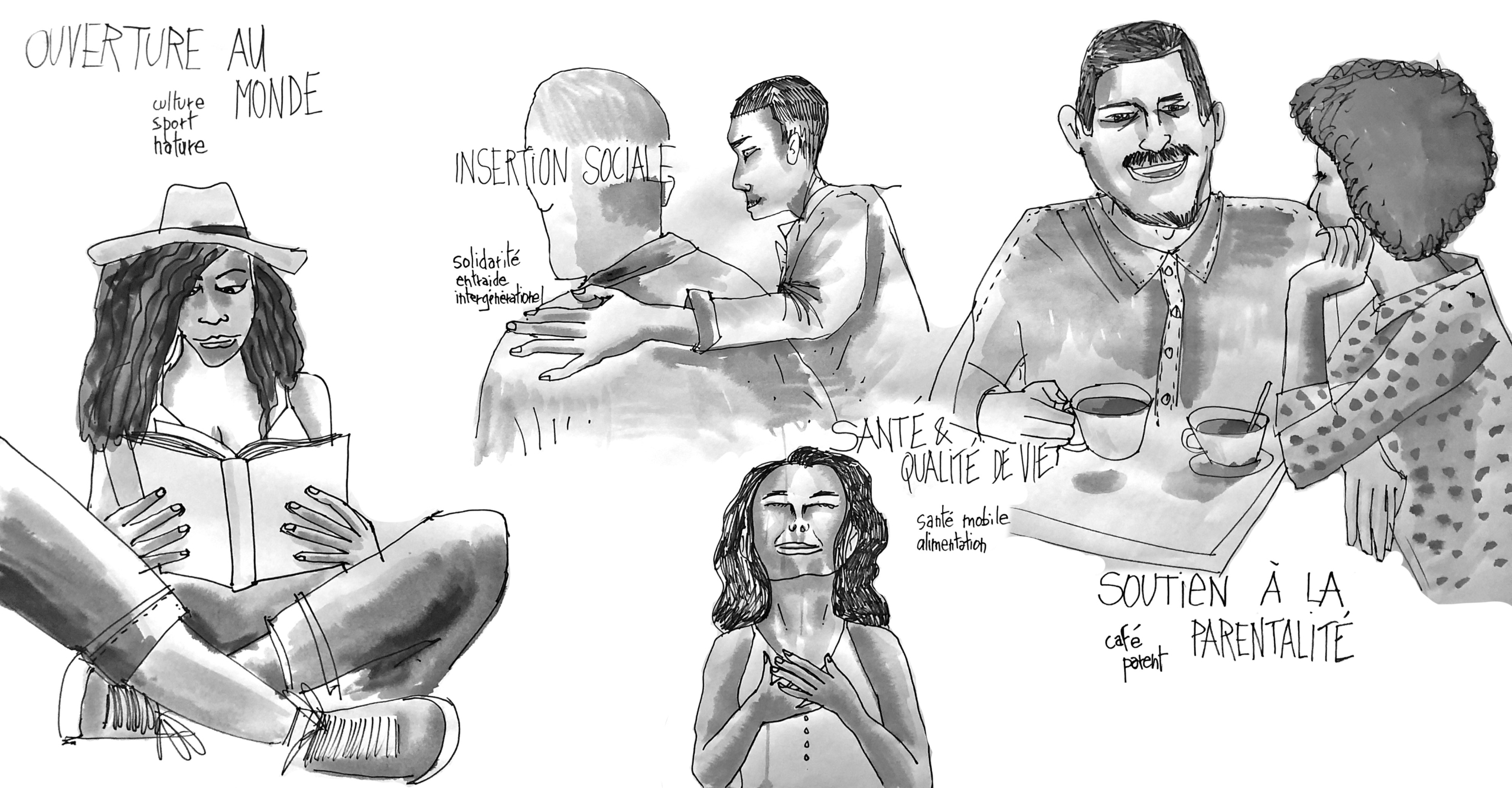 Le dessin est stylisé, léger, avec quelques valeurs de gris.
