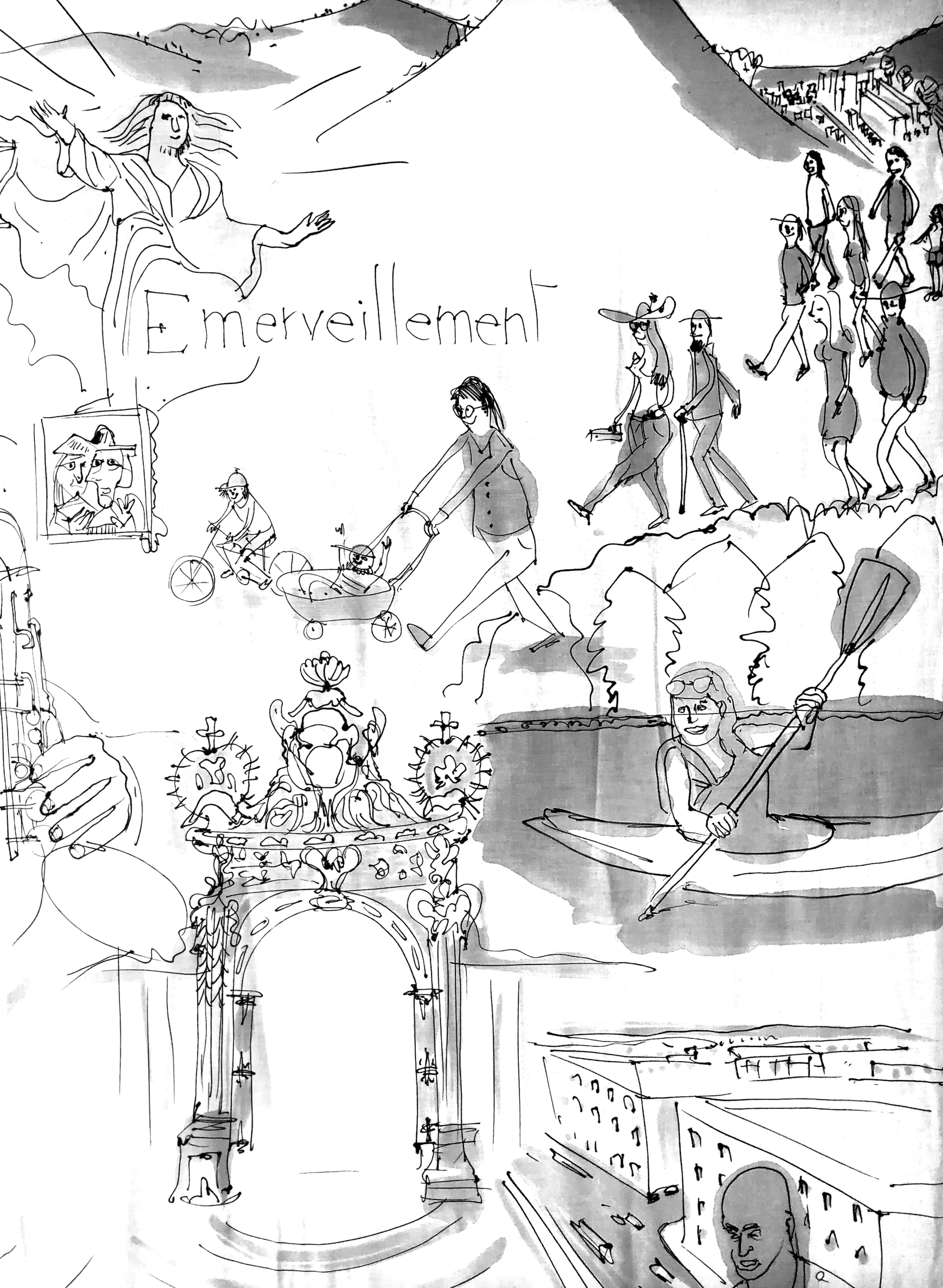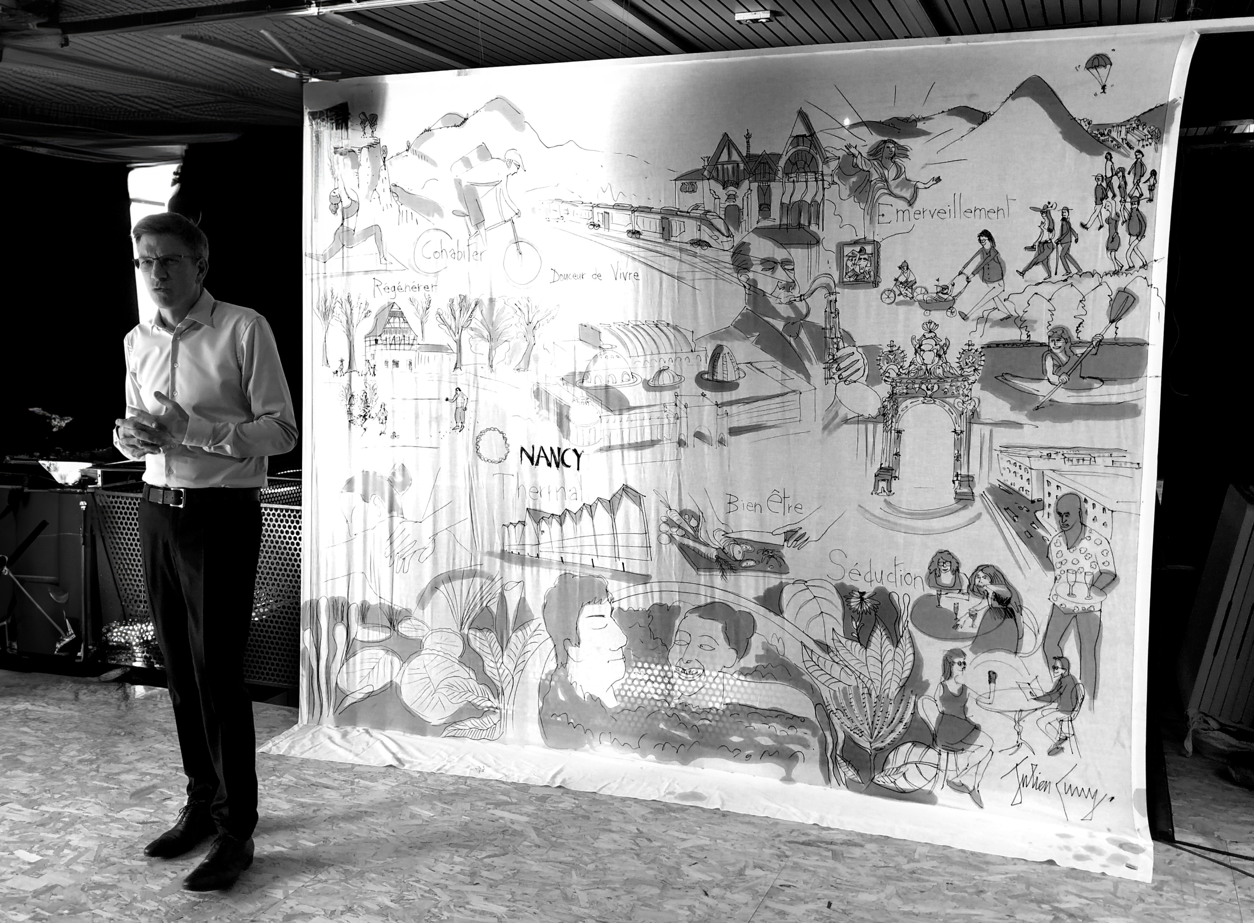 Je préfère créé une grande fresque, épique, qui rassemblent les lieux, les bâtiments phares du territoire, les acteurs de terrain, à la manière d’une affiche de cinéma.